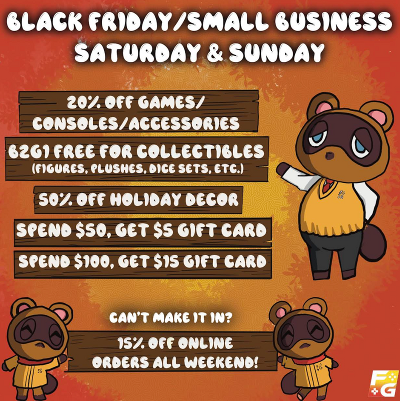 From Saturday November 29th to Sunday, November 30th, visit our store and enjoy Black Friday savings! Including 20% off games, consoles, & accessories, buy two get one free for collectibles, 50% off holiday decor, and bonus gift cards for spending $50 or more! If you can't make it to the store, you can also get 15% off on our online shop.