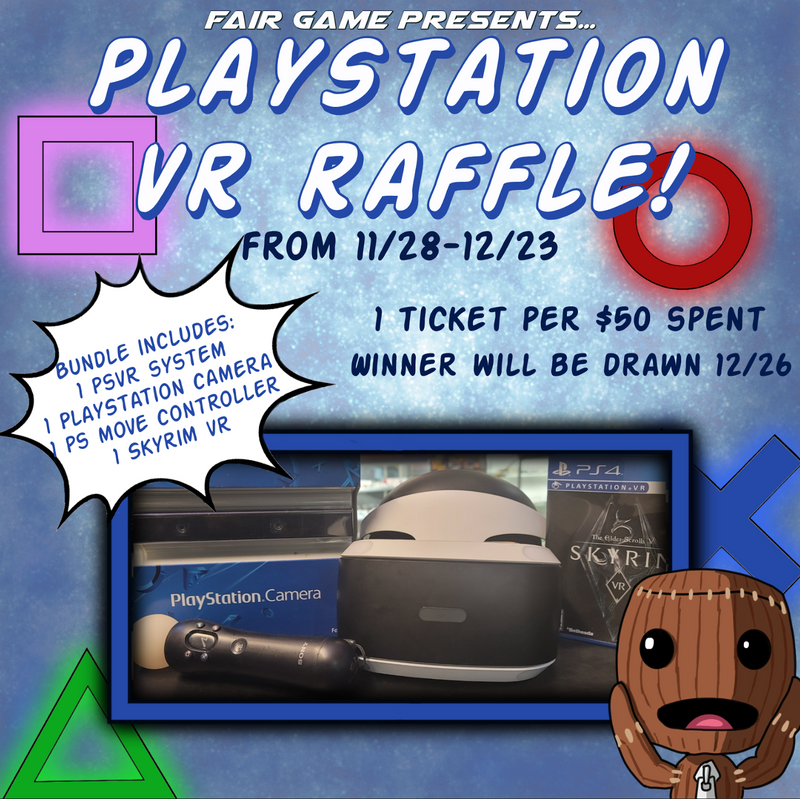 Starting Black Friday and running until the day before Christmas Eve, get one raffle ticket for our PSVR raffle per $50 spent. The winner will be drawn on December 26th.